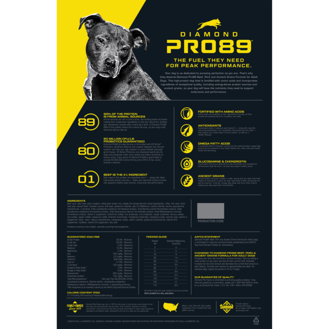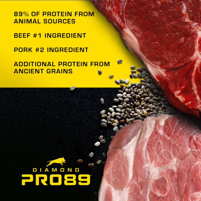 タンパク質を詰め込み、エネルギー密度の高いソースからのアミノ酸で強化,ダイヤモンドPro89牛肉,豚肉&成犬のための古代穀物式は、彼らがハードワークと持久力をサポートするために必要な栄養素をパフォーマンス犬に与えます。そして、筋肉を構築し、維持するために、タンパク質の89%は動物源からのものです。