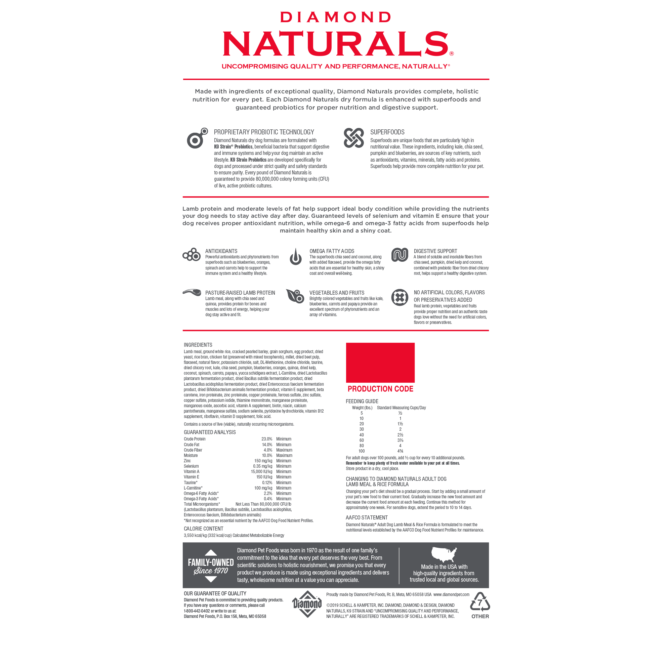 動物の副産物と小麦を不使用で、優れた品質の成分で作られたダイヤモンドナチュラルズドッグフードは、すべてのペットに完全で総合的な栄養を提供します。