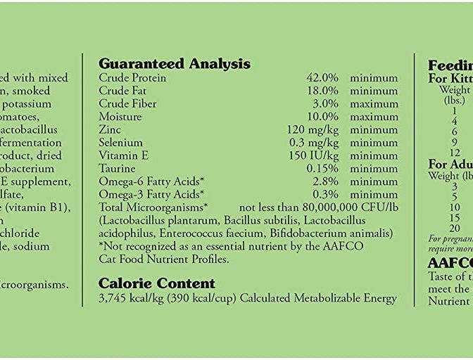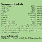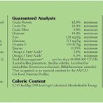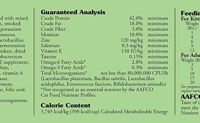 タンパク質 42.0%以上 脂質 18.0%以上 粗繊維 3.0%以下 水分 10.0%以下 亜鉛 120mg/kg以上 セレン 0.3mg/kg以上 ビタミンE 150IU/kg以上 タウリン 0.15%以上 オメガ6脂肪酸 2.8%以上 オメガ3脂肪酸 0.3%以上