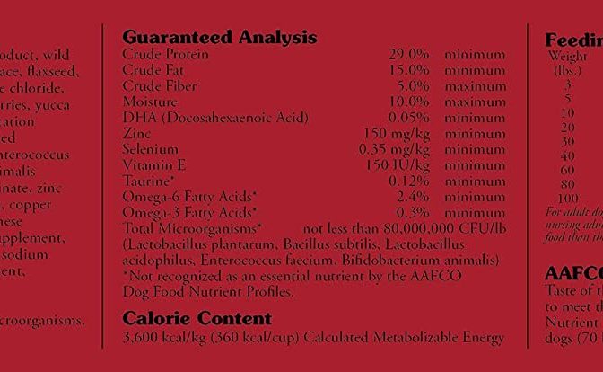 牛肉、エンドウ豆、ひよこ豆、ラムミール、キャノーラ油、加工卵、イノシシ、フィッシュミール、エンドウ 粉、ビール酵母、トマト滓、亜麻仁、ナチュラルフレーバー、サーモンオイル(DHA源)、食塩、塩化コリン、 乾燥チコリ根、トマト、ブルーベリー、ラズベリー、ユッカエキス、ラクトバチルス・アシドフィルス、ビフィ ドバクテリウム・アニマリス、ラクトバチルス・ロイテリ、ビタミンEサプリメント、鉄タンパク化合物、亜鉛タ ンパク化合物、銅タンパク化合物、硫酸鉄、硫酸亜鉛、硫酸銅、ヨウ化カリウム、硝酸チアミン(ビタミン B1)、マンガンタンパク化合物、酸化マンガン、アスコルビン酸、ビタミンAサプリメント、ビオチン、ナイ アシン、パントテン酸カルシウム、硫酸マンガン、亜セレン酸ナトリウム、塩酸ピリドキシン(ビタミンB6)、 ビタミンB12サプリメント、リボフラビン(ビタミンB2)、ビタミンDサプリメント、葉酸