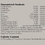 ダック、ダックミール、チキンミール、卵製品、サツマイモ、エンドウ豆、鶏肉脂肪(混合トコフェロールで保存)、ジャガイモ、ローストウズラ、鴨、スモークターキー、ナチュラルフレーバー、トマト絞りかす、フィッシュミール、塩、塩化コリン、乾燥チコリ根、トマト、ブルーベリー、ラズベリー、ユッカエキス、乾燥発酵腸球菌フェシウム、乳酸菌、カセイ乳酸菌プランタラム、乾燥発酵トリコデルマロンギブラキアタム抽出物、補助ビタミンE、鉄タンパク化合物、亜鉛タンパク化合物、銅タンパク化合物、硫酸鉄、硫酸亜鉛、硫酸銅、ヨウ化カリウム、チアミン硝酸塩(ビタミンB1)、マンガンタンパク化合物、酸化マンガン、アスコルビン酸、ビタミン補助食品、ビオチン、ナイアシン、マンガンパントテン酸カルシウム、硫酸塩、亜セレン酸ナトリウム、ピリドキシン塩酸塩(ビタミンB6)、ビタミンB12サプリメント、リボフラビン(ビタミンB2)、ビタミンDサプリメント、葉酸。